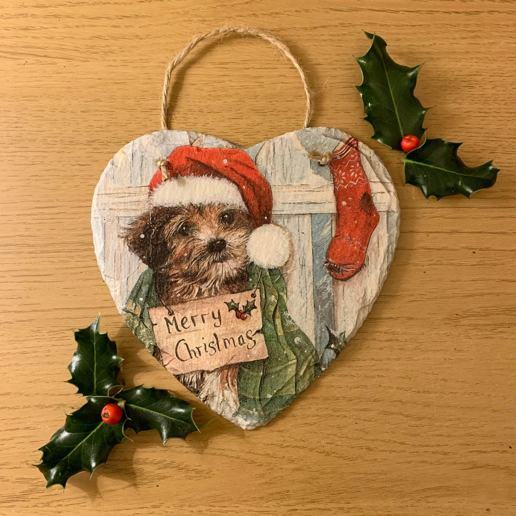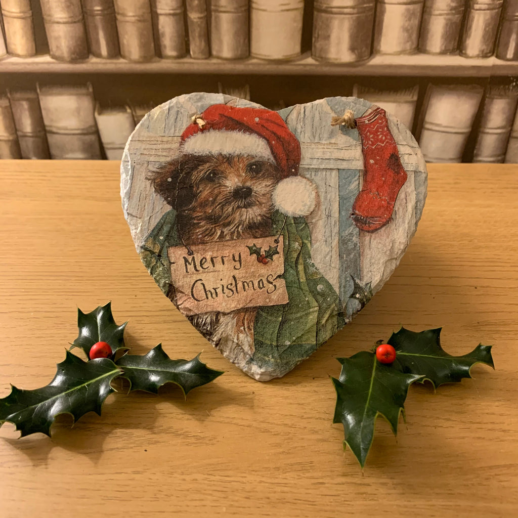 Christmas Puppy Decoupaged Slate Heart (Ready To Hang)