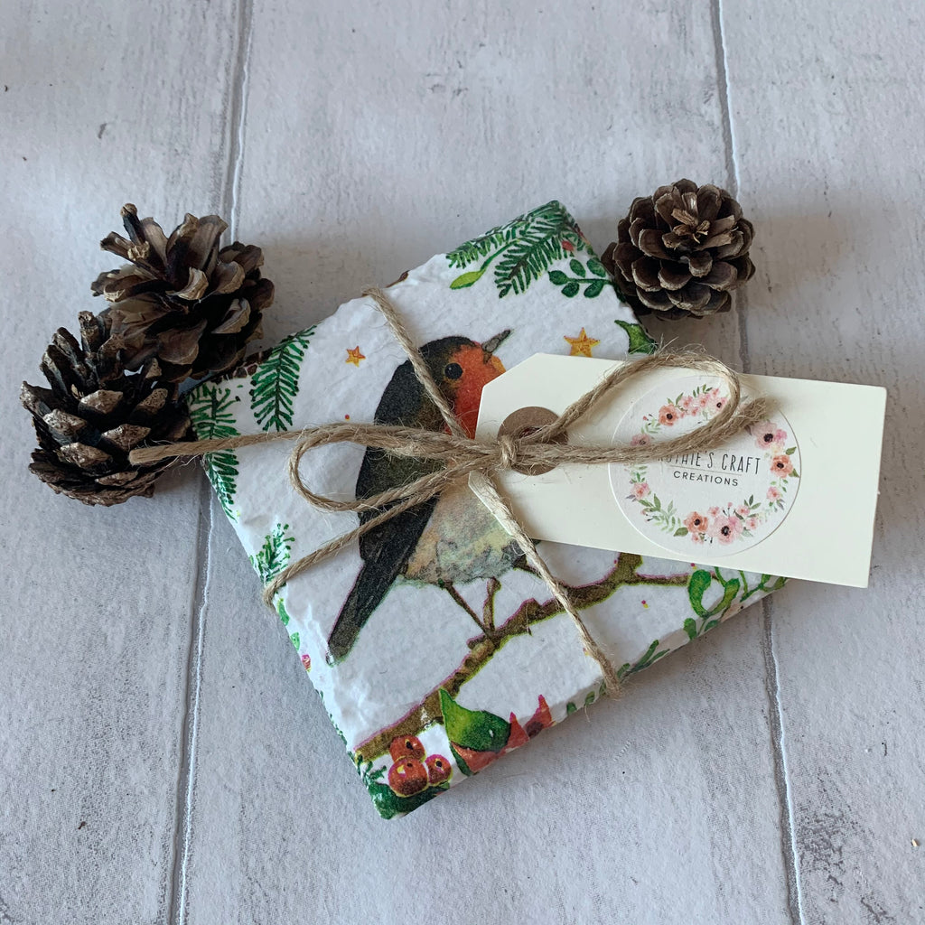 This set of slate coasters have been painted using high quality chalk paint and then decoupaged using quality printed wrap and sealed in clear matt varnish for protection. This design is Christmas Robin