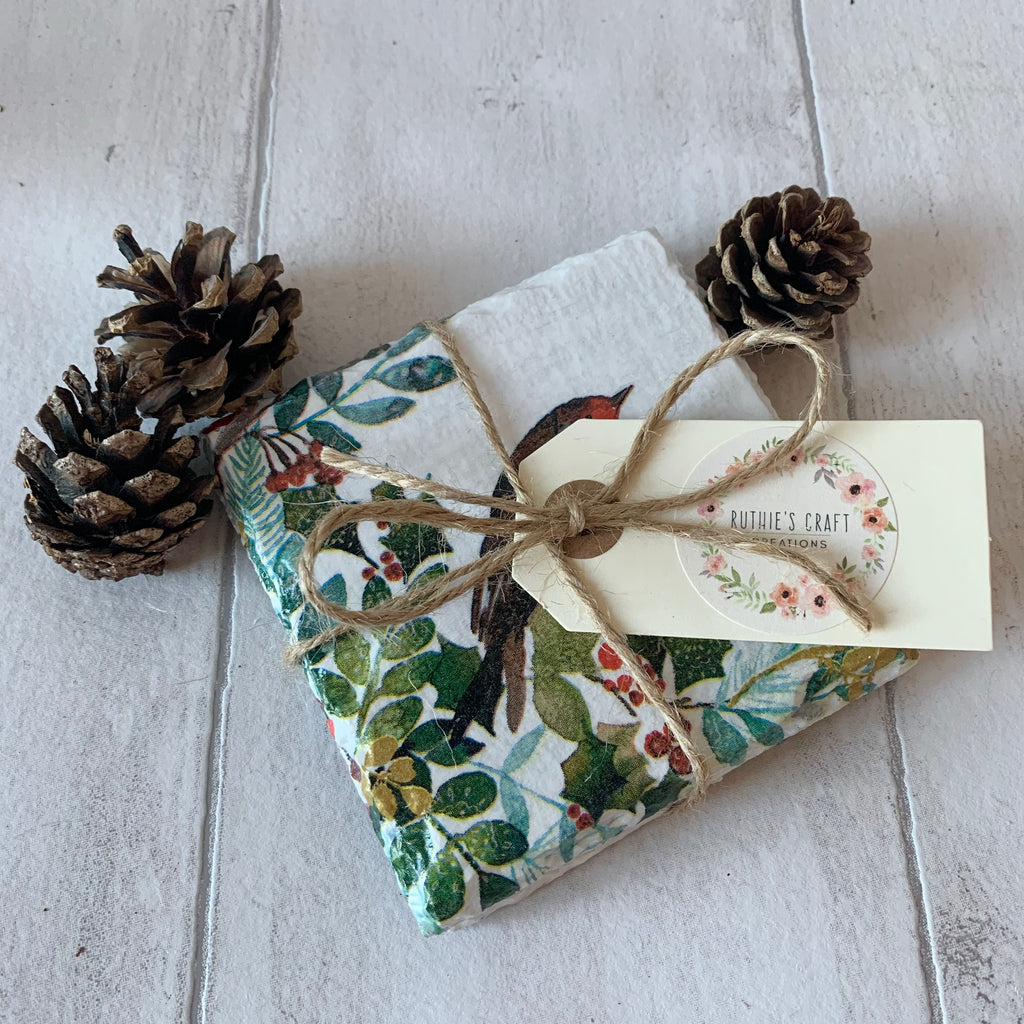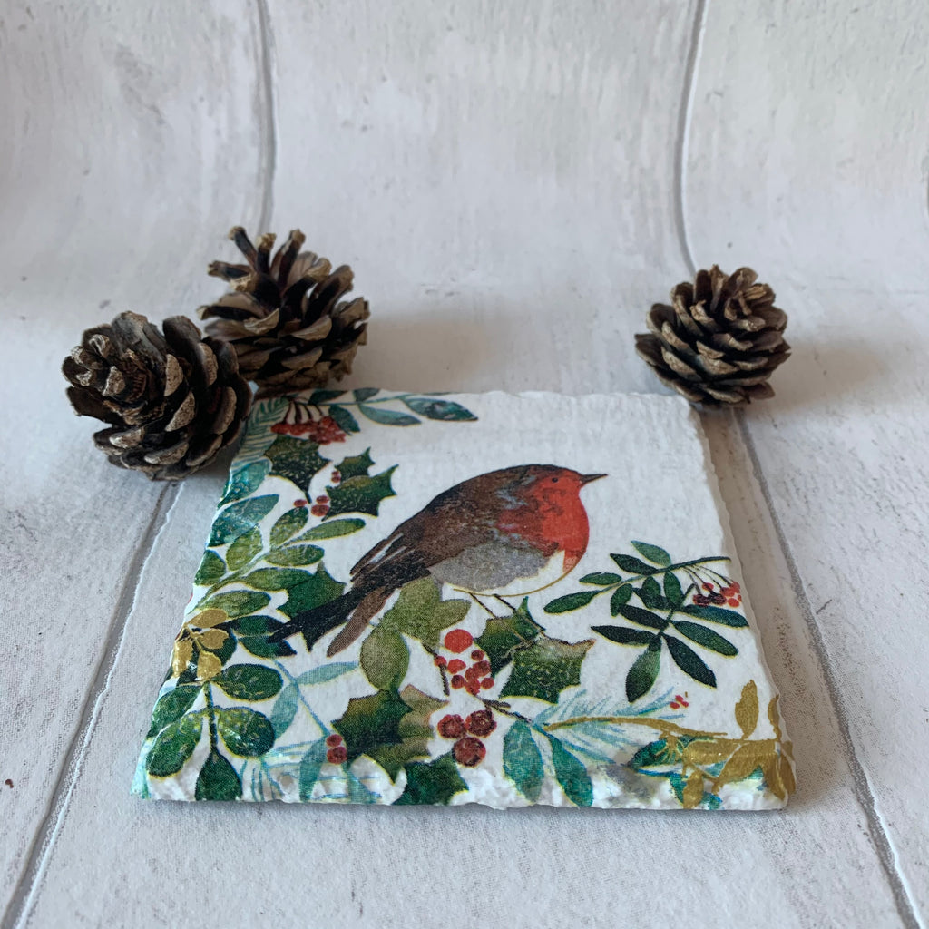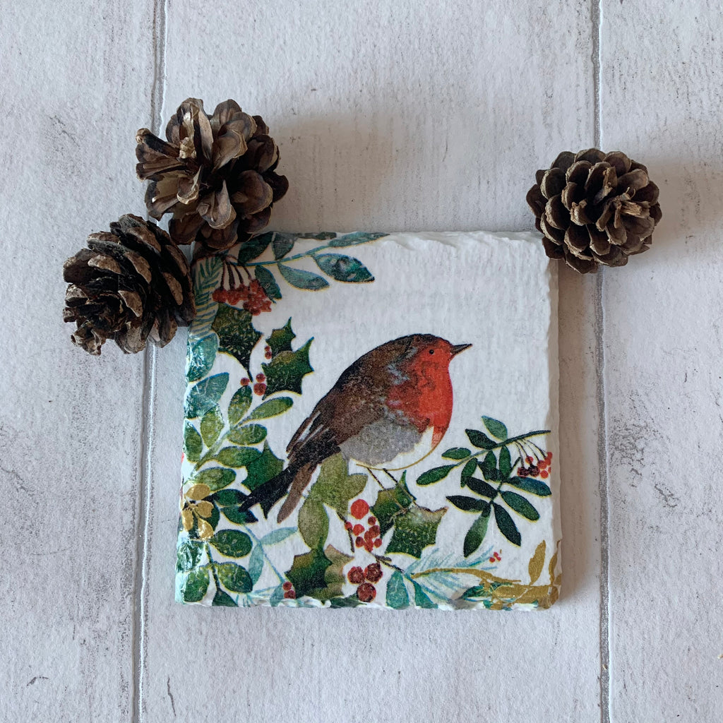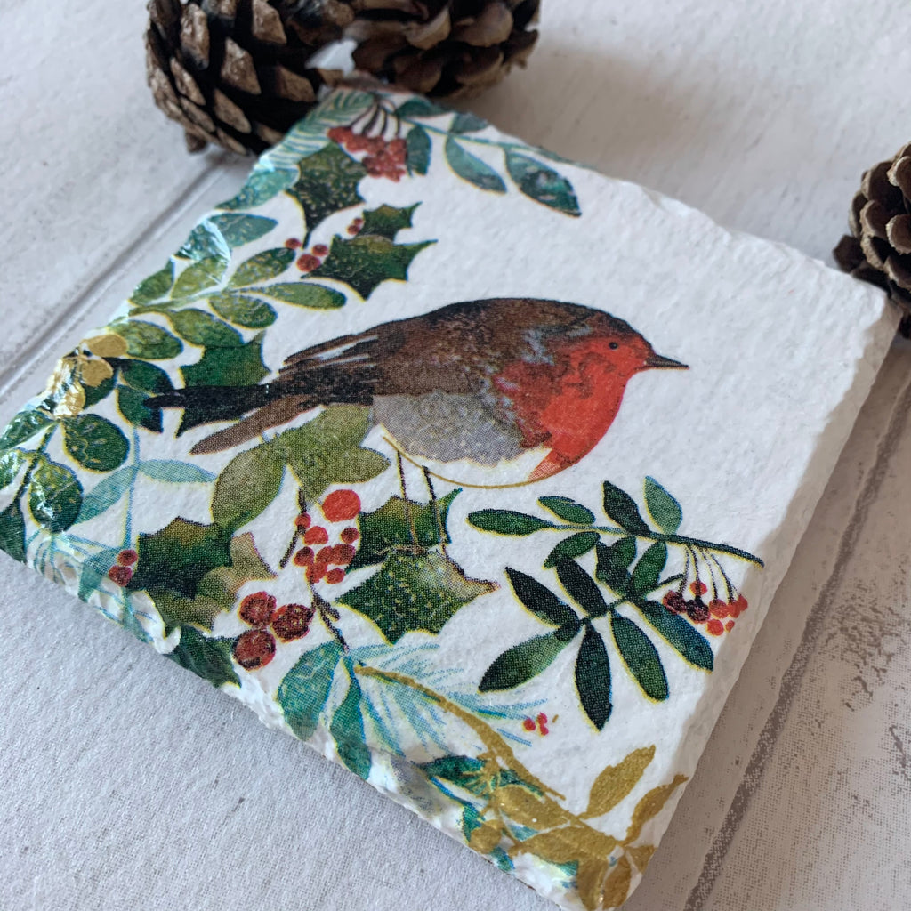 This set of slate coasters have been painted using high quality chalk paint and then decoupaged using quality printed wrap and sealed in clear matt varnish for protection. This design is Modern Robin