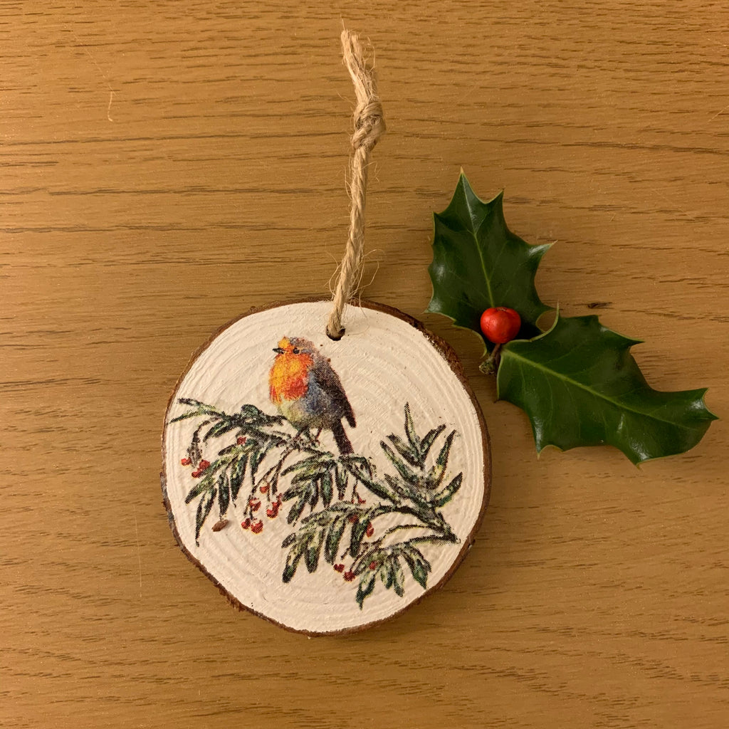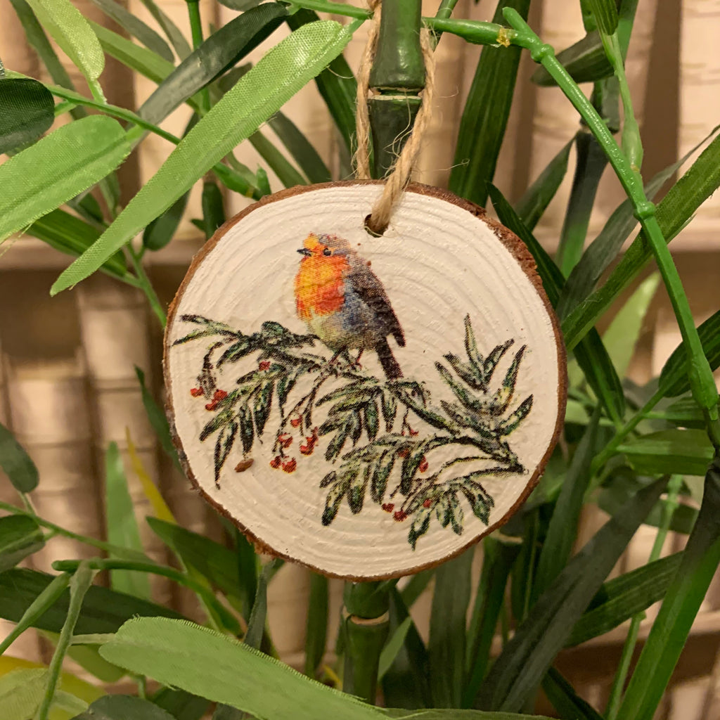 Robin Branch Wooden Log Slice Hanging Decoration | Christmas Decoration | Tree Decoration