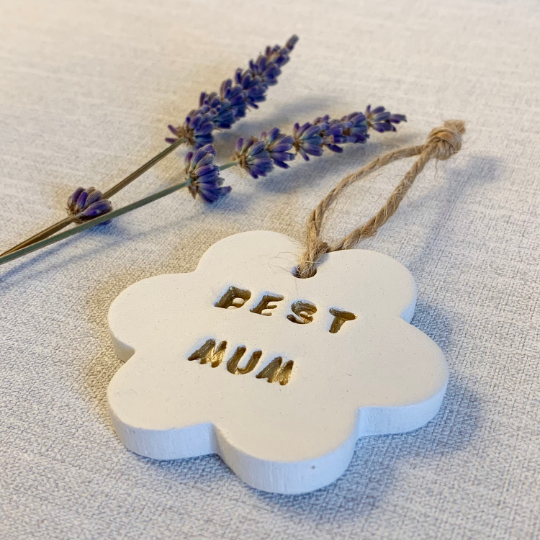 This handmade clay hanging decoration is in the shape of a flower with the words ‘Best Mum’ imprinted with a hanging hole and twine (included, ready for hanging). The decoration measures 6x6cm