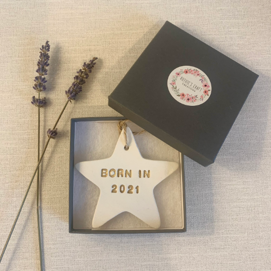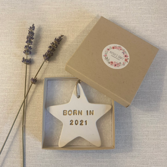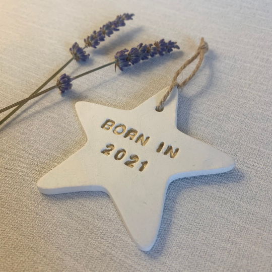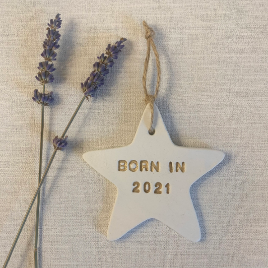 This handmade clay hanging decoration is in the shape of a star with the words ‘Born In 2021’ imprinted with a hanging hole and twine (included, ready for hanging). The decoration measures 9x9cm