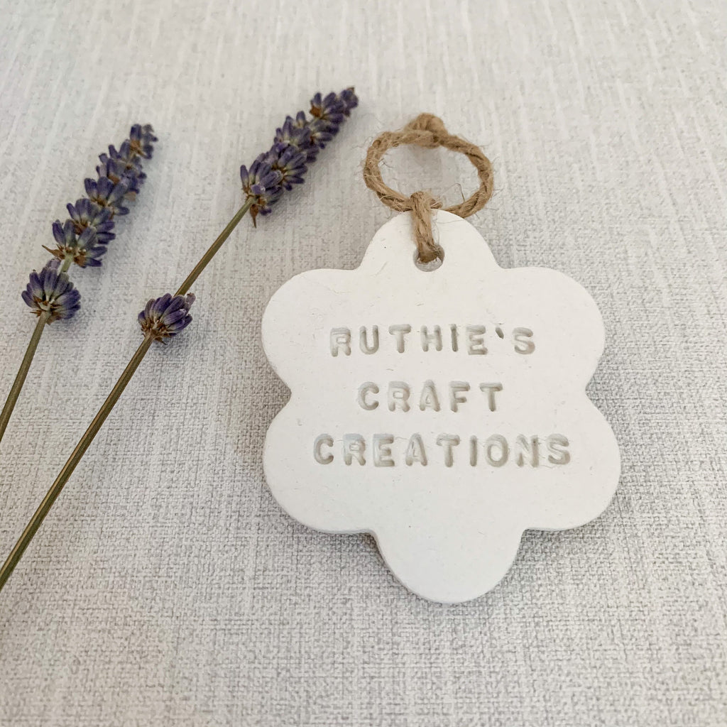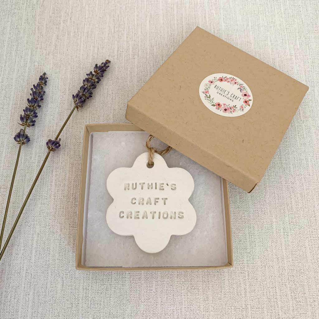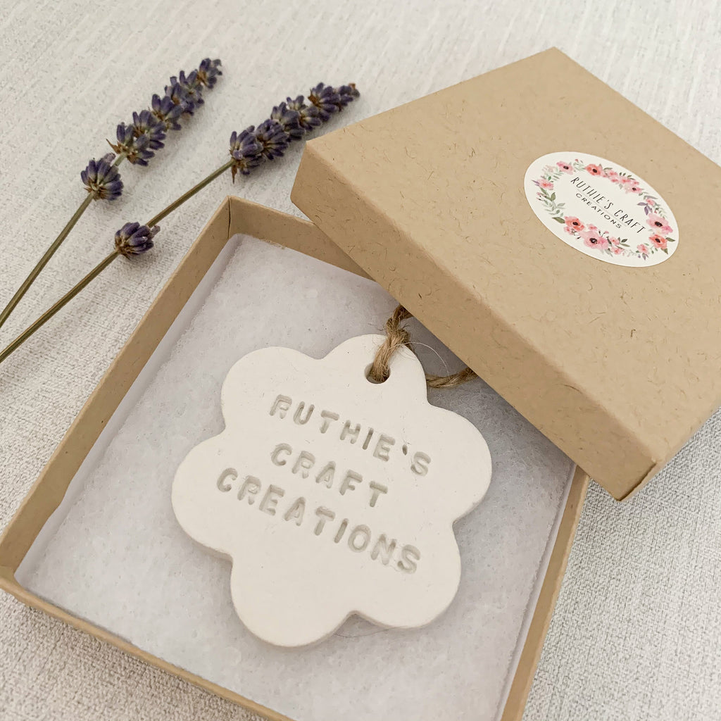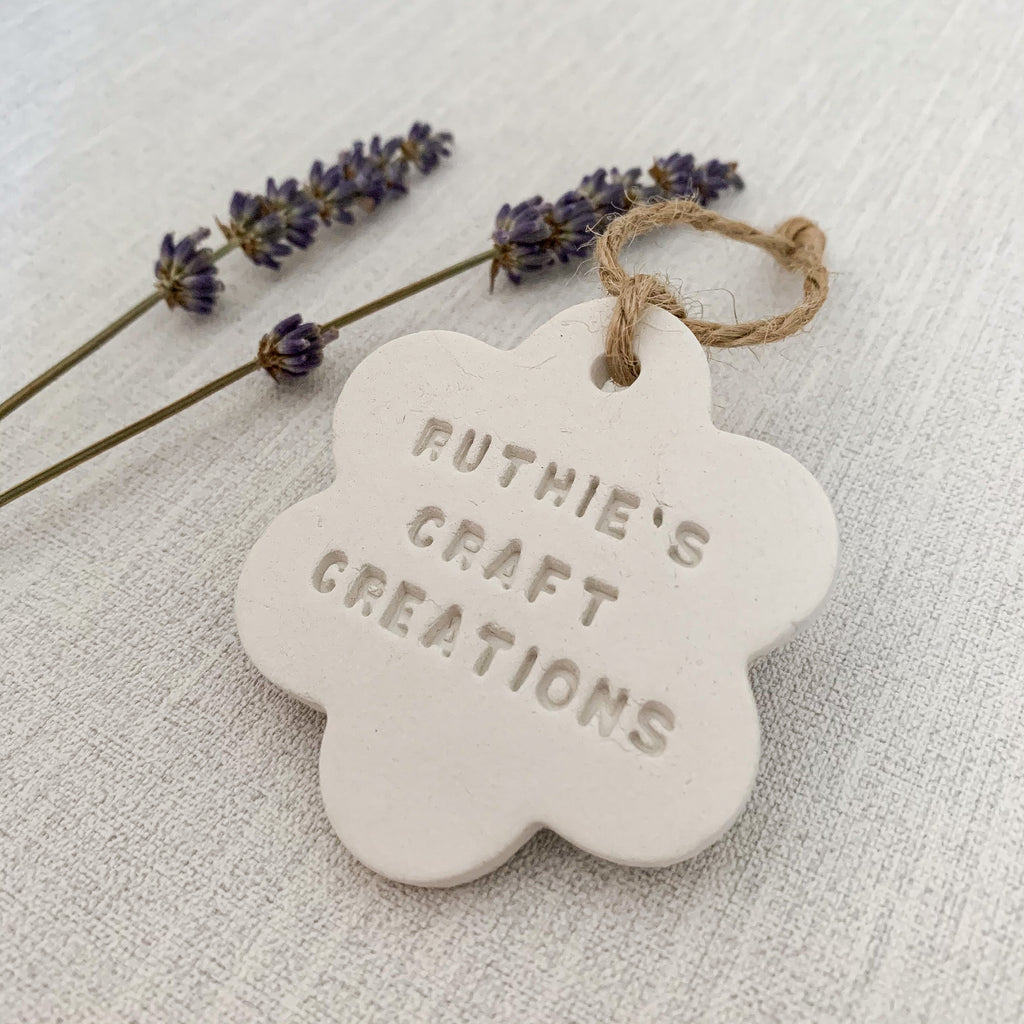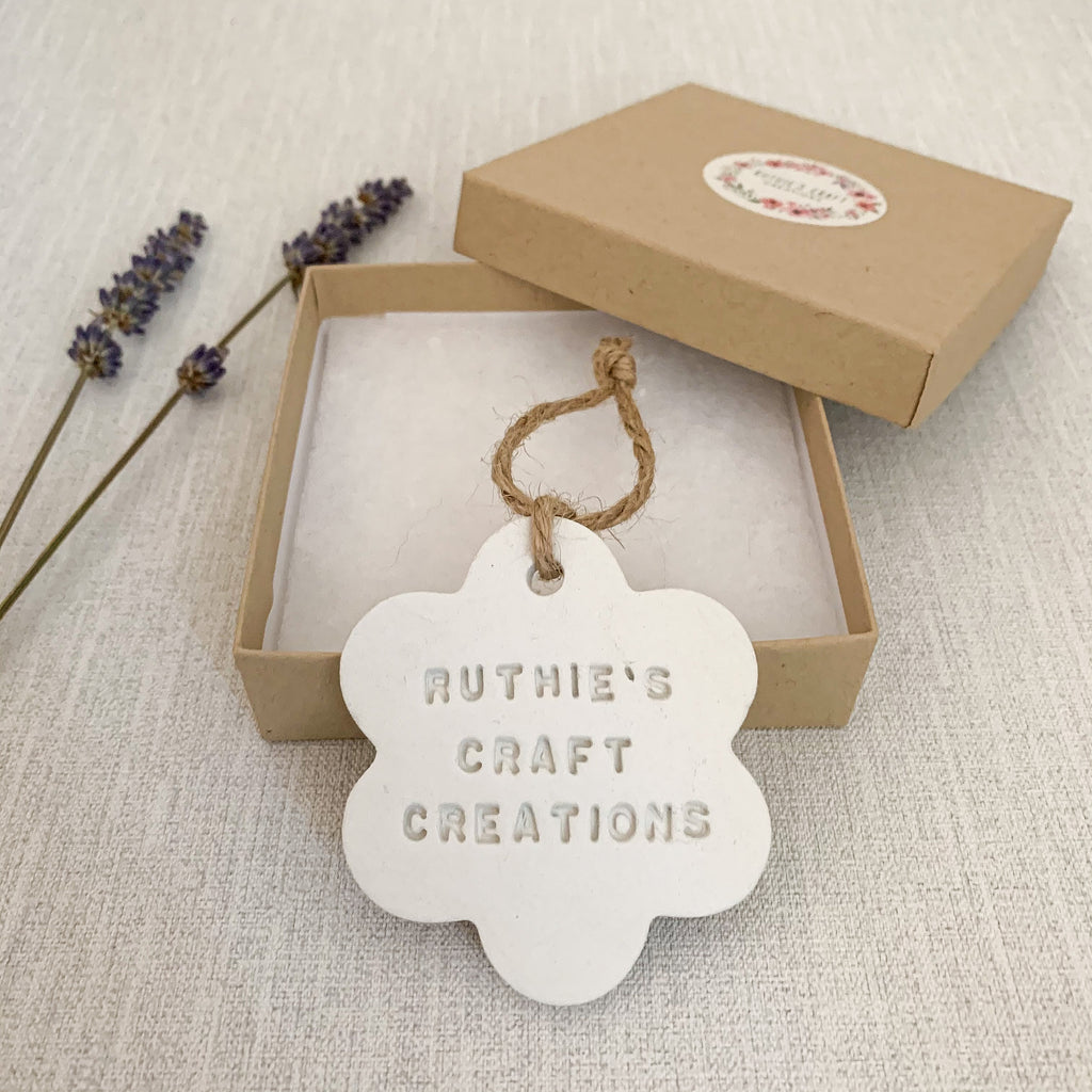 This handmade clay hanging decoration is in the shape of a flower and can be imprinted with up to four words of a business/company name. Pre made hanging hole and twine (included, ready for hanging). The decoration measures 6x6cm