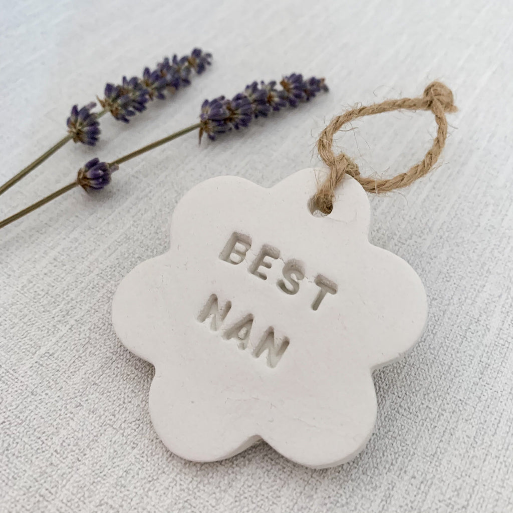 Clay is hand rolled, cut out, stamped with individual letters and sanded to ensure a smooth but natural finish