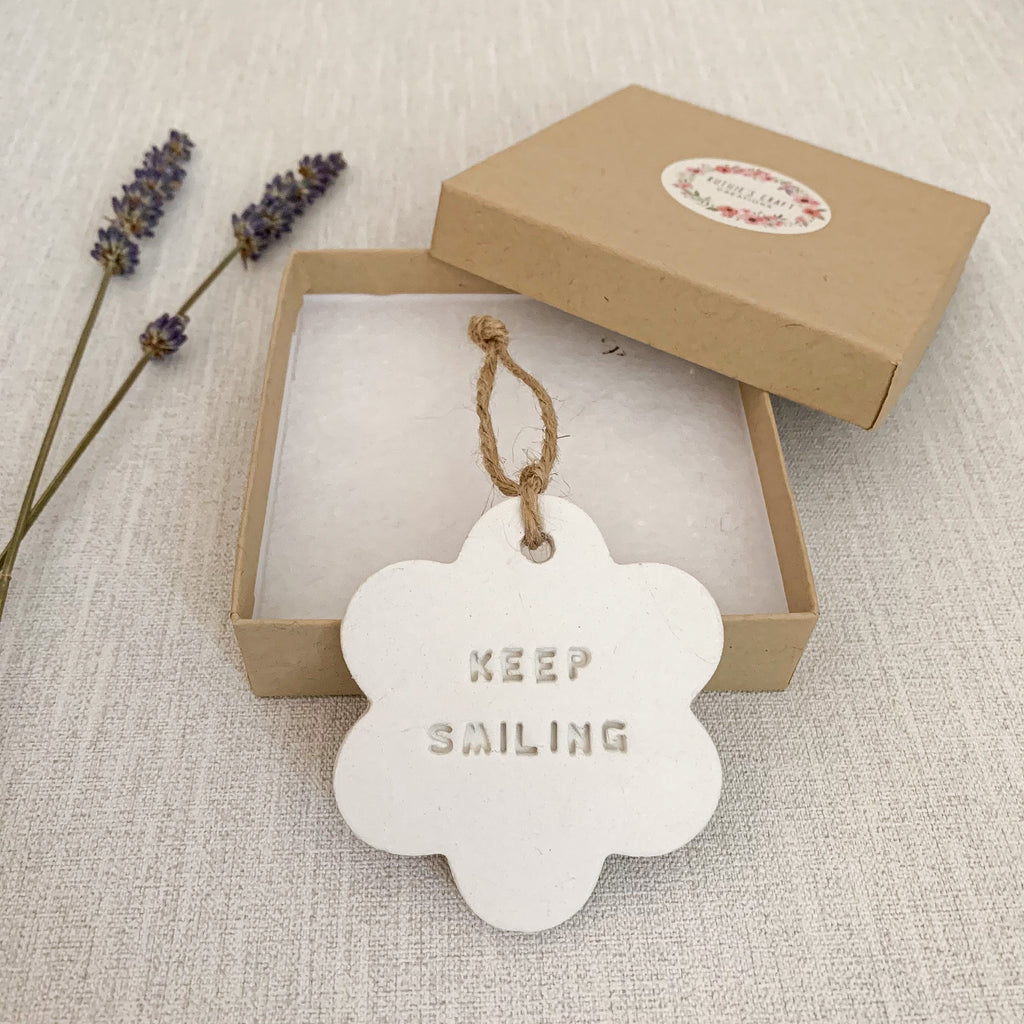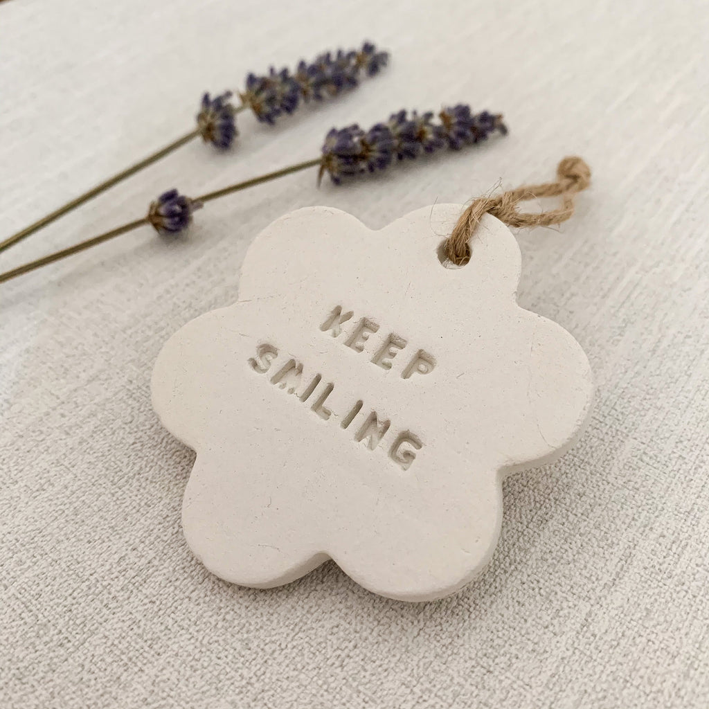 This handmade clay hanging decoration is in the shape of a flower with the words ‘Keep Smiling’ imprinted with a hanging hole and twine (included, ready for hanging). The decoration measures 6x6cm