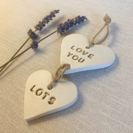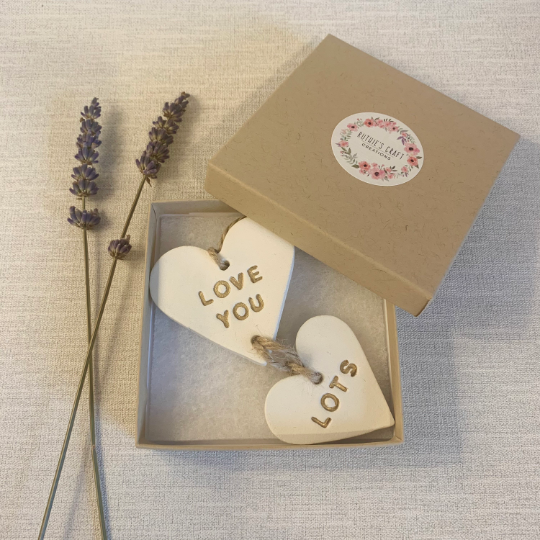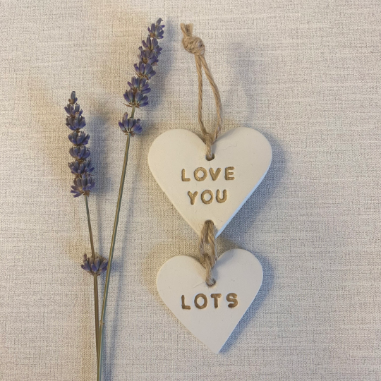 This handmade clay hanging decoration consists of two hearts hanging one below the other with the words ‘Love You Lots’ imprinted with a hanging hole and twine (included, ready for hanging). The decoration measures 11x6cm