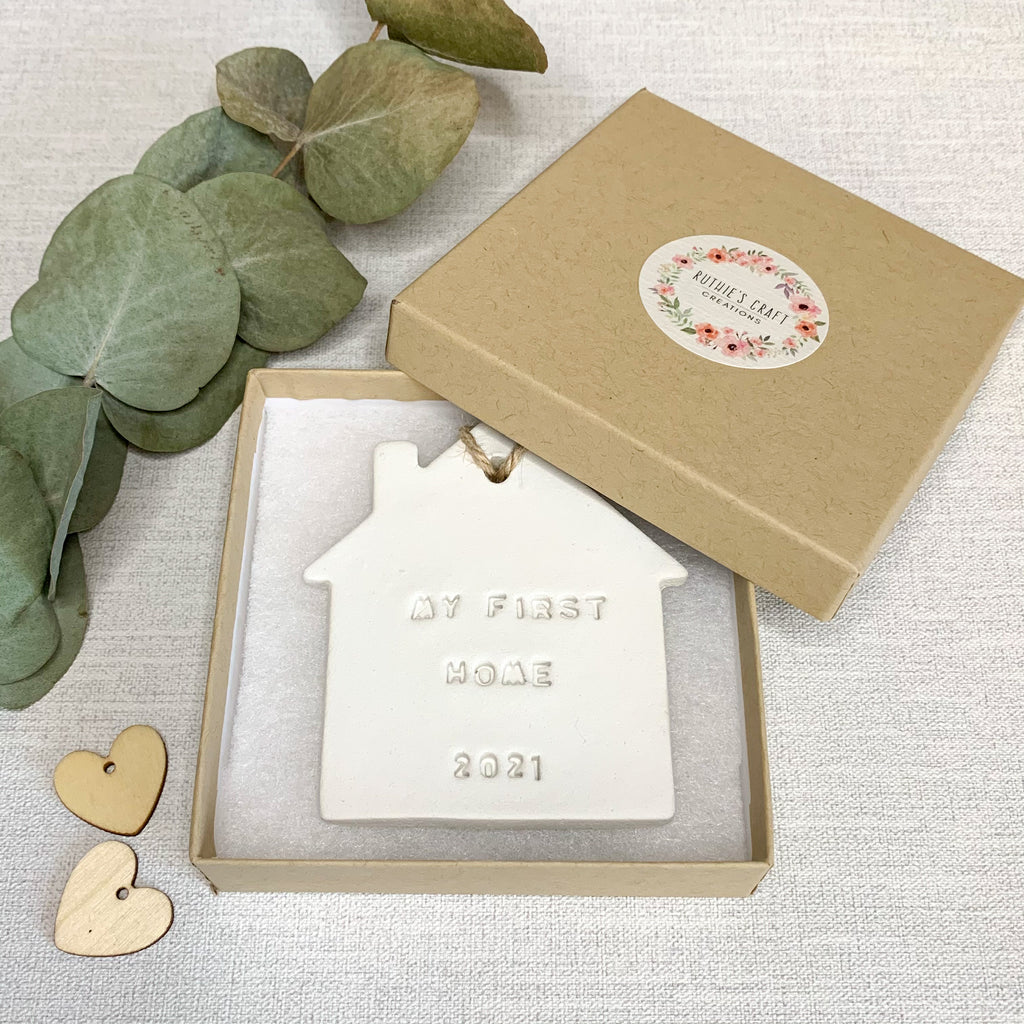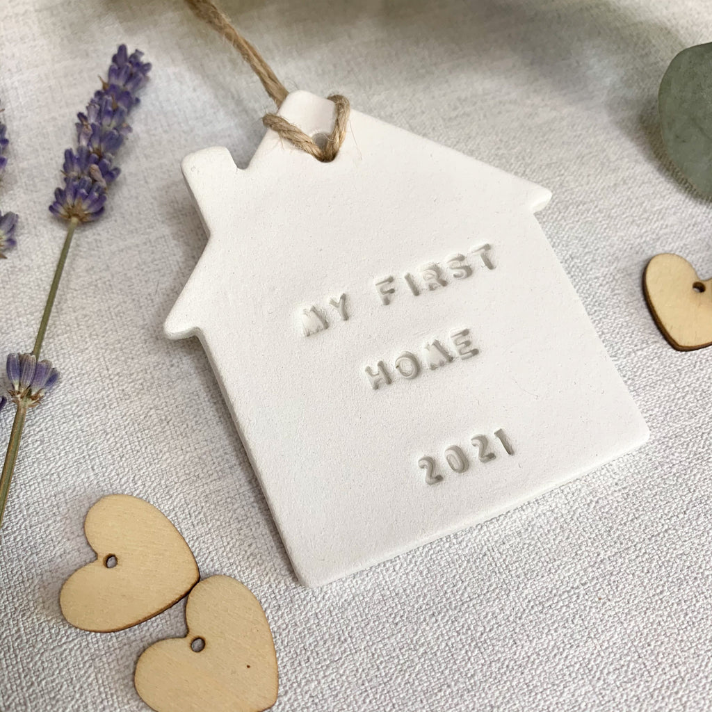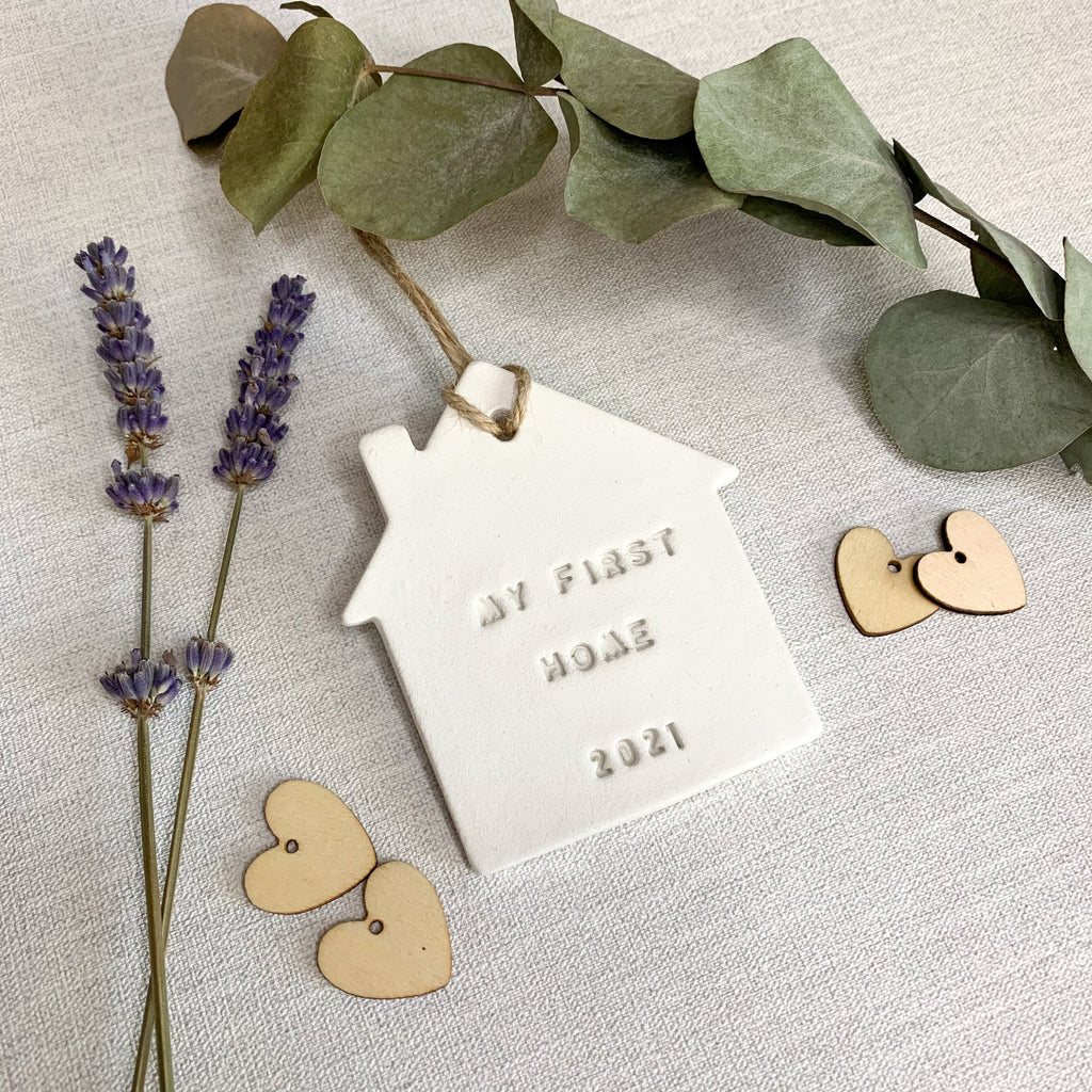 This handmade clay hanging decoration is in the shape of a house and has 'My First Home 2021' imprinted. The keepsake measures 8x7cm and comes ready to hang with twine attached