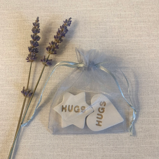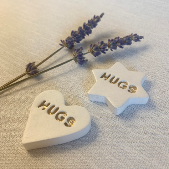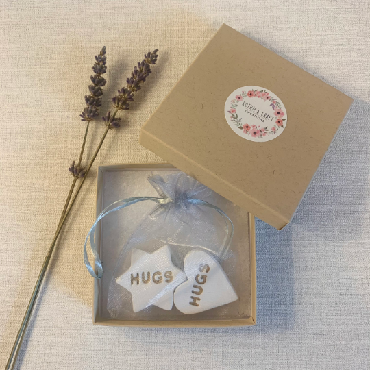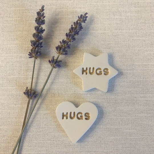 These handmade pocket hugs consist of one clay heart and one clay star, each with the word ‘hugs’ imprinted. Each heart and star measures 4x4cm