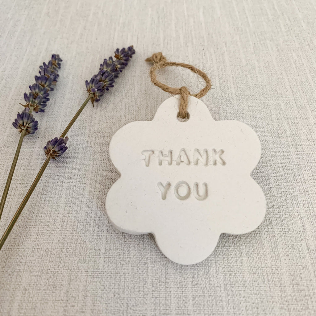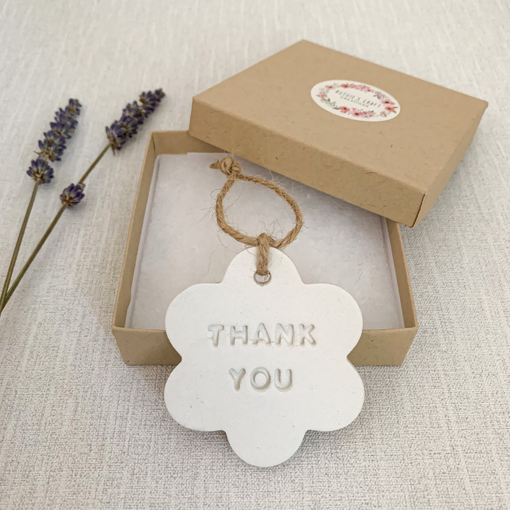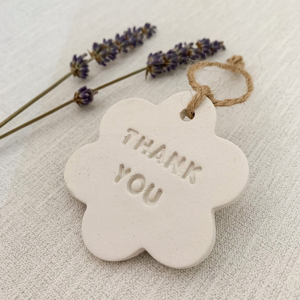 This handmade clay hanging decoration is in the shape of a flower with the words ‘Thank You’ imprinted with a hanging hole and twine (included, ready for hanging). The decoration measures 6x6cm