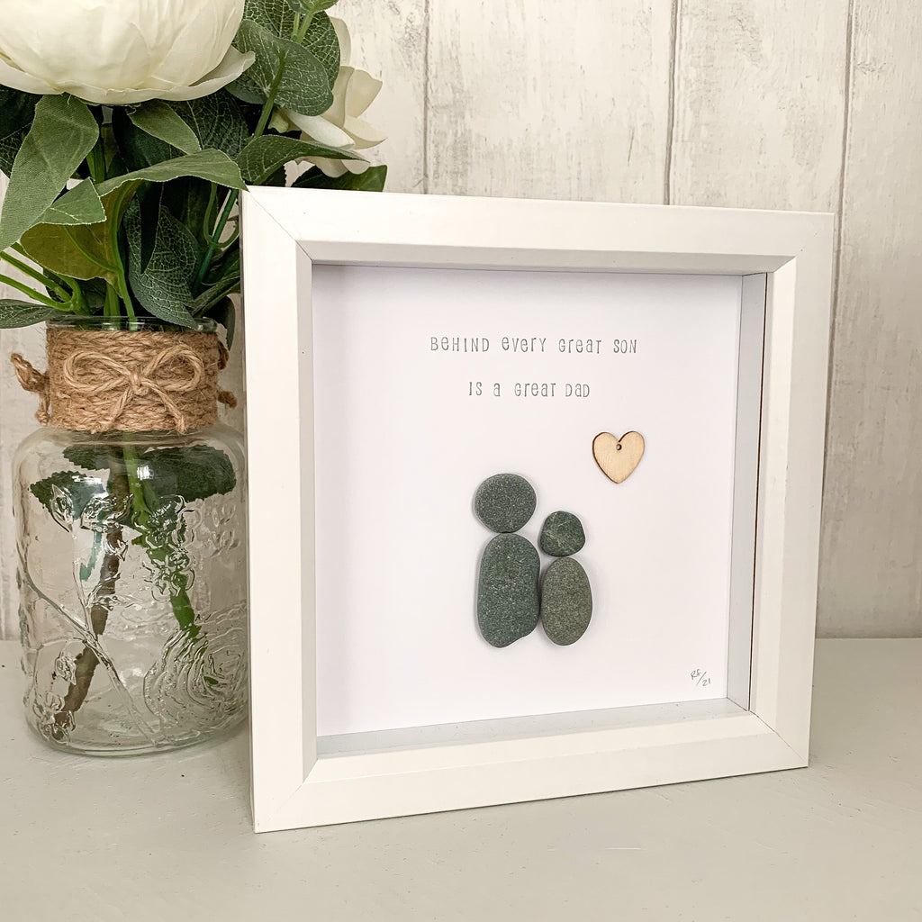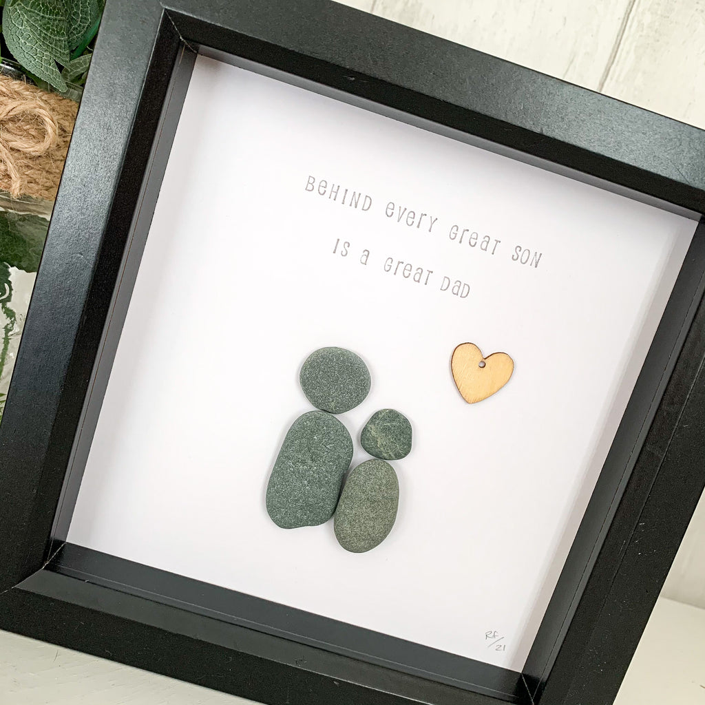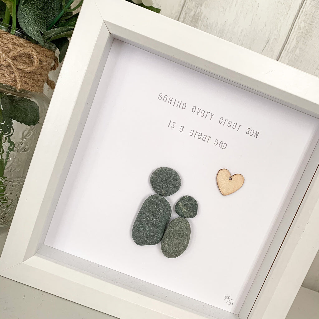 This design features two pebble people displayed on white backing card with a wooden heart. Stamped text displays "behind every great son is a great dad”