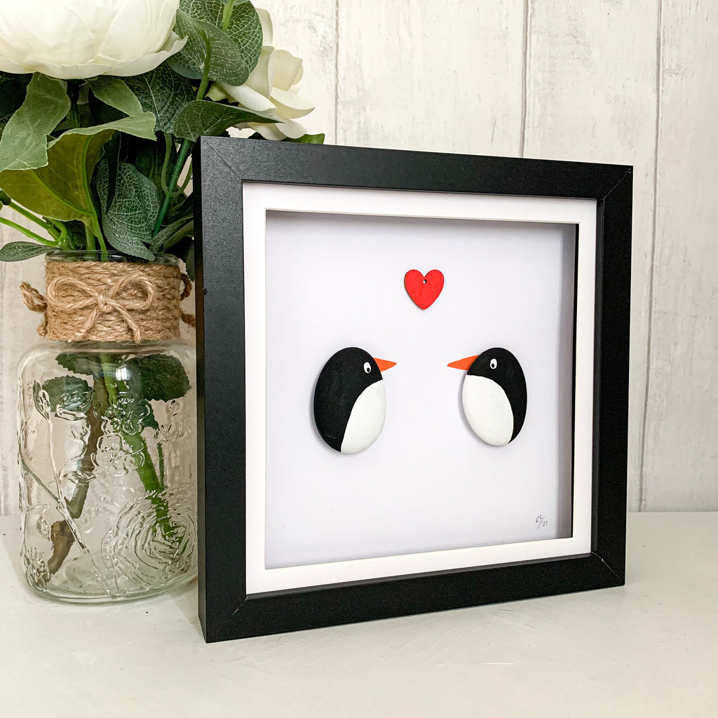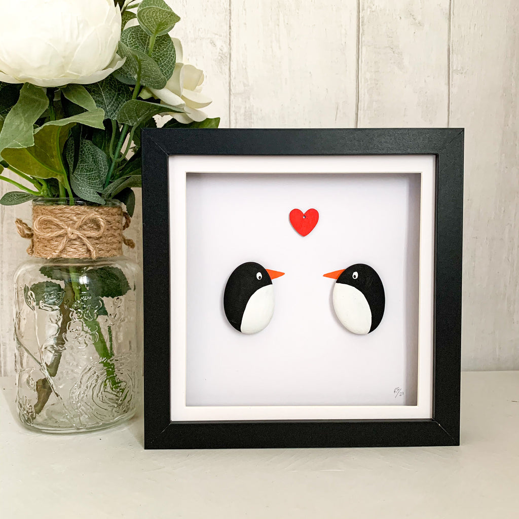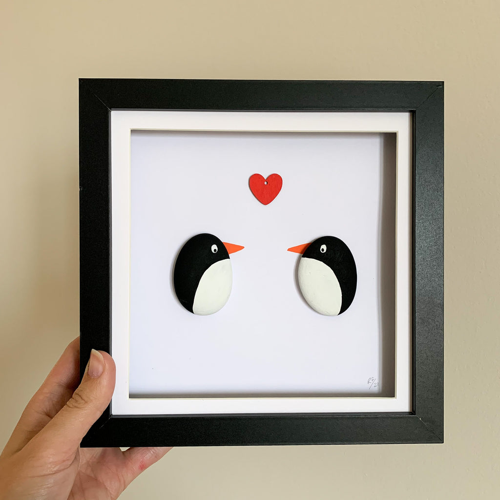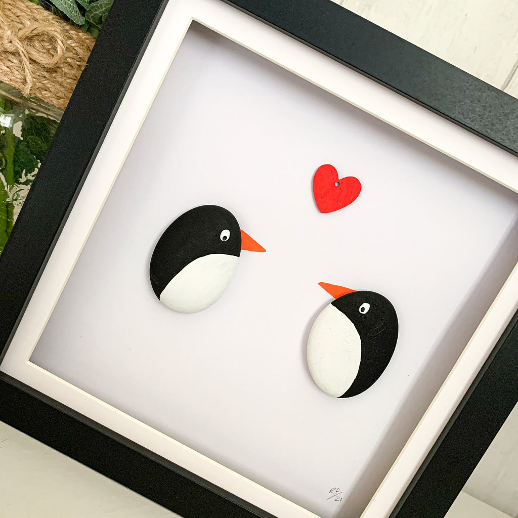This design features two pebbles painted as penguins with a red painted wooden heart displayed on white backing card