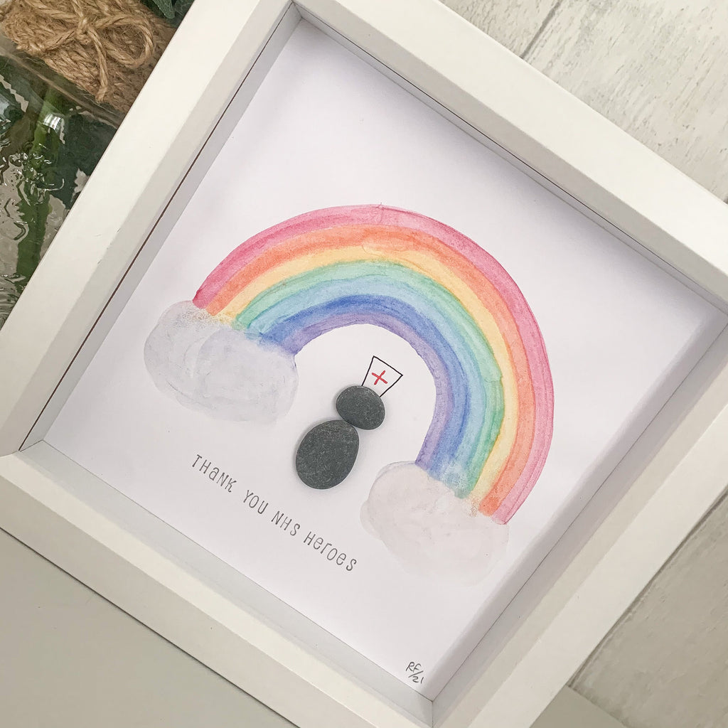 The rainbow has been hand painted using watercolour paint and a pebble person with a medical hat stands underneath the rainbow. Stamped text reads ‘thank you NHS heroes’