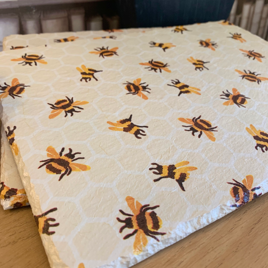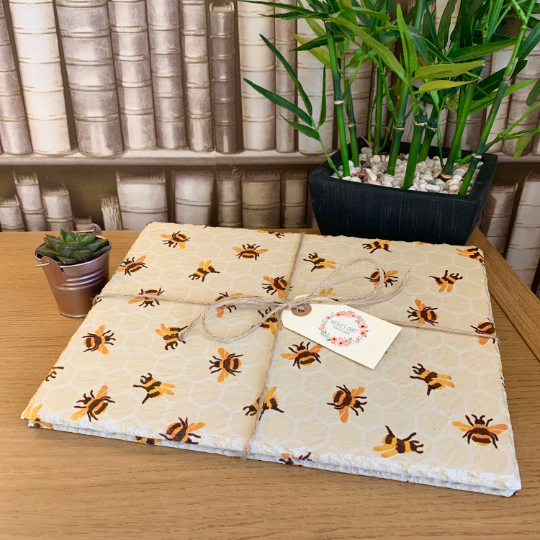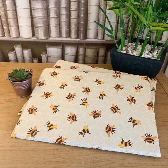This set of slate coasters have been painted using high quality chalk paint and then decoupaged using quality printed wrap and sealed in clear matt varnish for protection. This design is EB Bumblebee