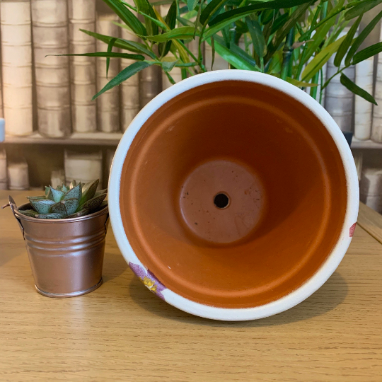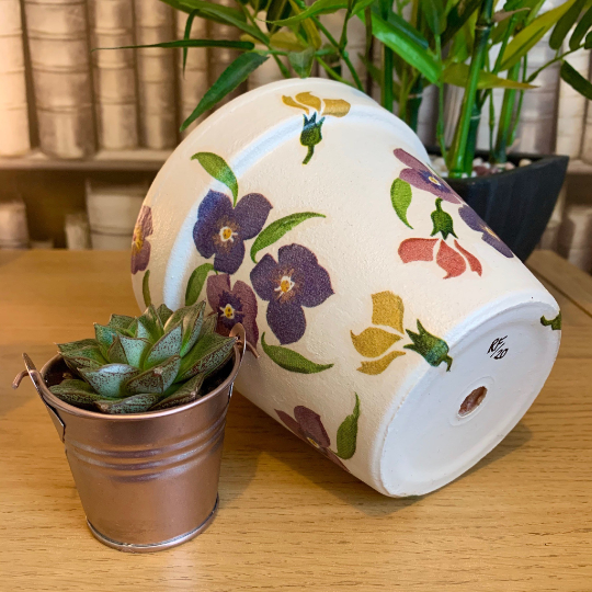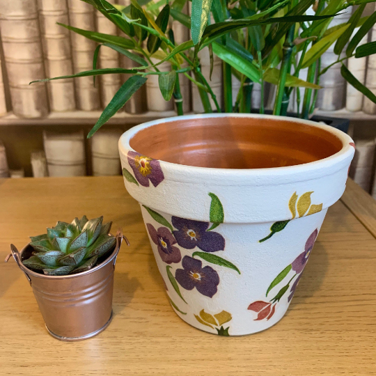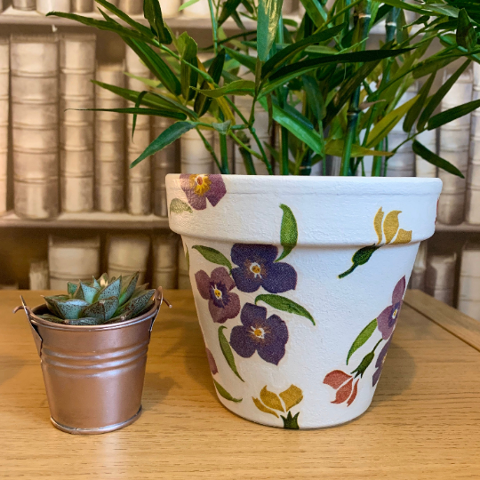 This terracotta pot with central drainage hole has been hand painted using high quality chalk paint and decoupaged with the beautiful EB ‘Wallflower’ pattern