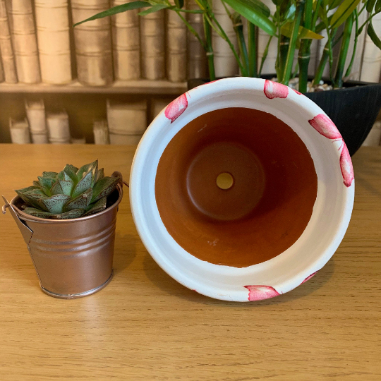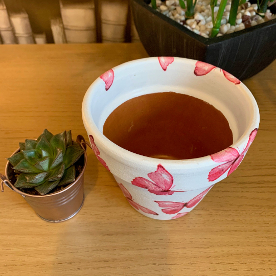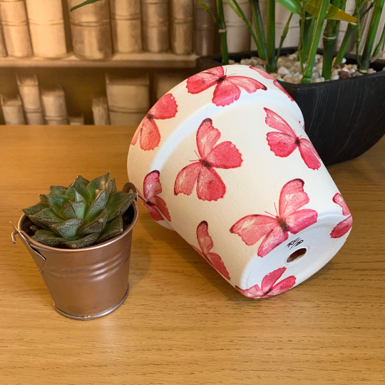 This terracotta pot with central drainage hole has been hand painted using high quality chalk paint and decoupaged with a beautiful pink butterflies pattern