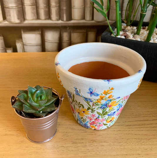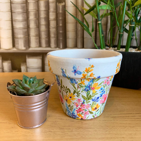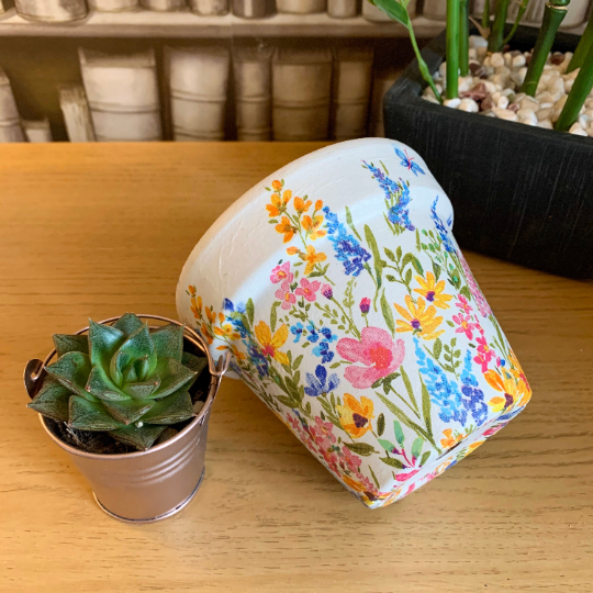 This terracotta pot with central drainage hole has been hand painted using high quality chalk paint and decoupaged with a beautiful wild meadow flowers pattern